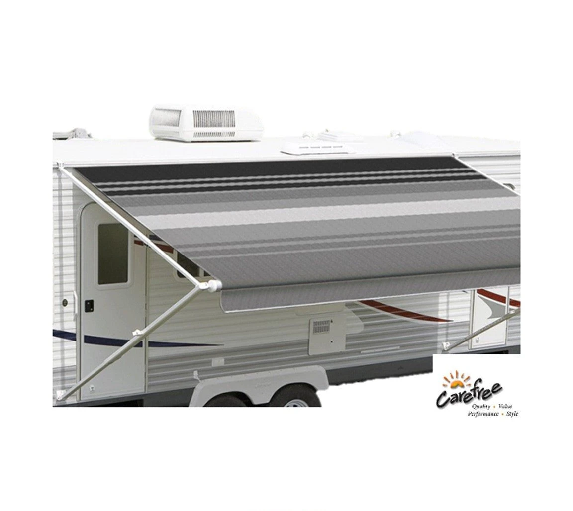 Carefree’s vinyl fabric features a superior construction with the top portion being called the Weatherguard – this protects the fabric from the sun, scrapes and exposure when the awning is rolled up. The Carefree Fiesta has long been a favourite amongst RV’ers, not only in the USA but here in Australia as well. It is a simple to use manual, spring loaded, rollout awning featuring a vinyl weatherguard as previously mentioned. The Fiesta is available in two finishes, Dune Stripes (this coloured on both sides) and Shale Fades (this is coloured on the top side only).