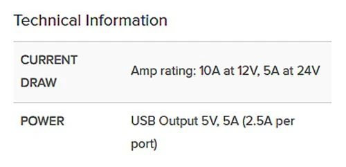 Amp rating: 10A at 12V, 5A at 24V USB Output 5V, 5A (2.5A per port)