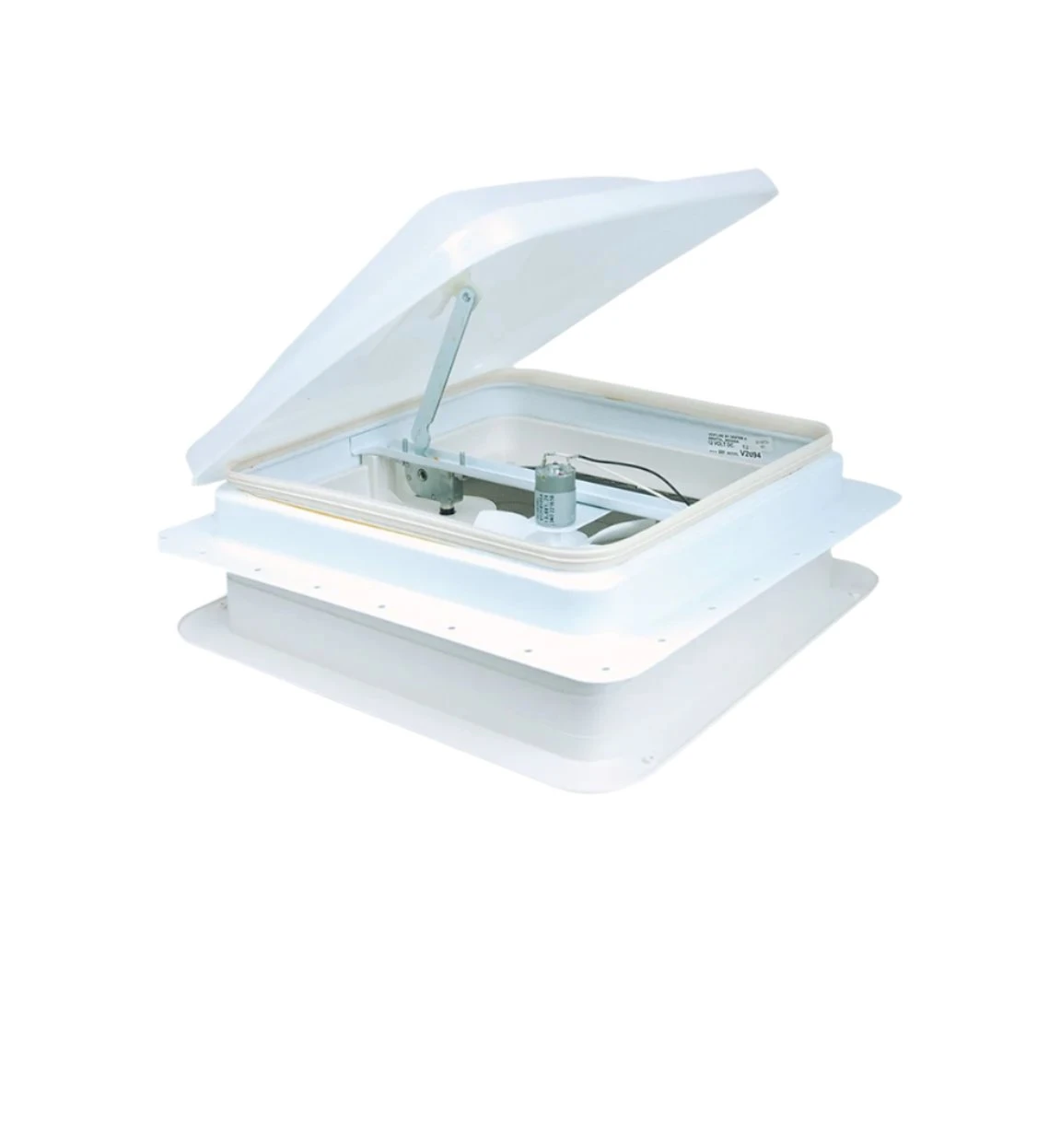This Ventline Vent has a 12V DC motor making it able to power a fan for faster air delivery. It also has extra strong galvanized steel roof flanges in a painted white finish and mounts onto the roof of your RV with screws. The dome is also white with an aerodynamic design. The screen frame also has radius corners and consists of two removable pieces. The 12V fan is controlled by an on/off switch fitted to the vent.